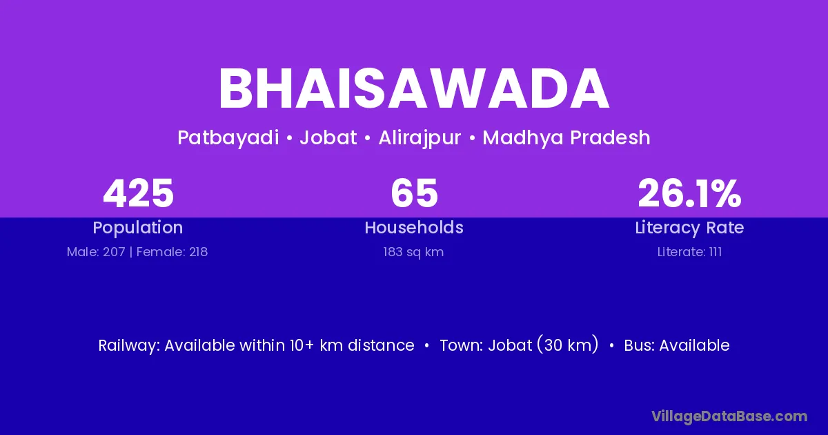 Jobat (30 km) is the nearest town to Bhaisawada village for major economic activities and is located approximately 30 km away.