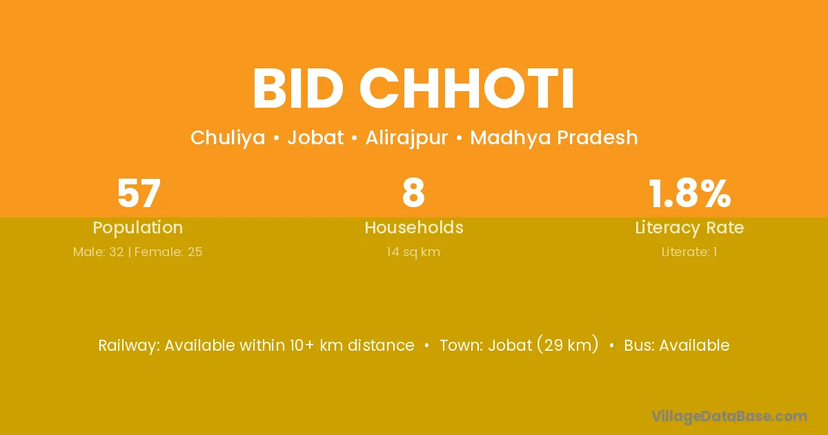 Jobat (29 km) is the nearest town to Bid Chhoti village for major economic activities and is located approximately 29 km away.