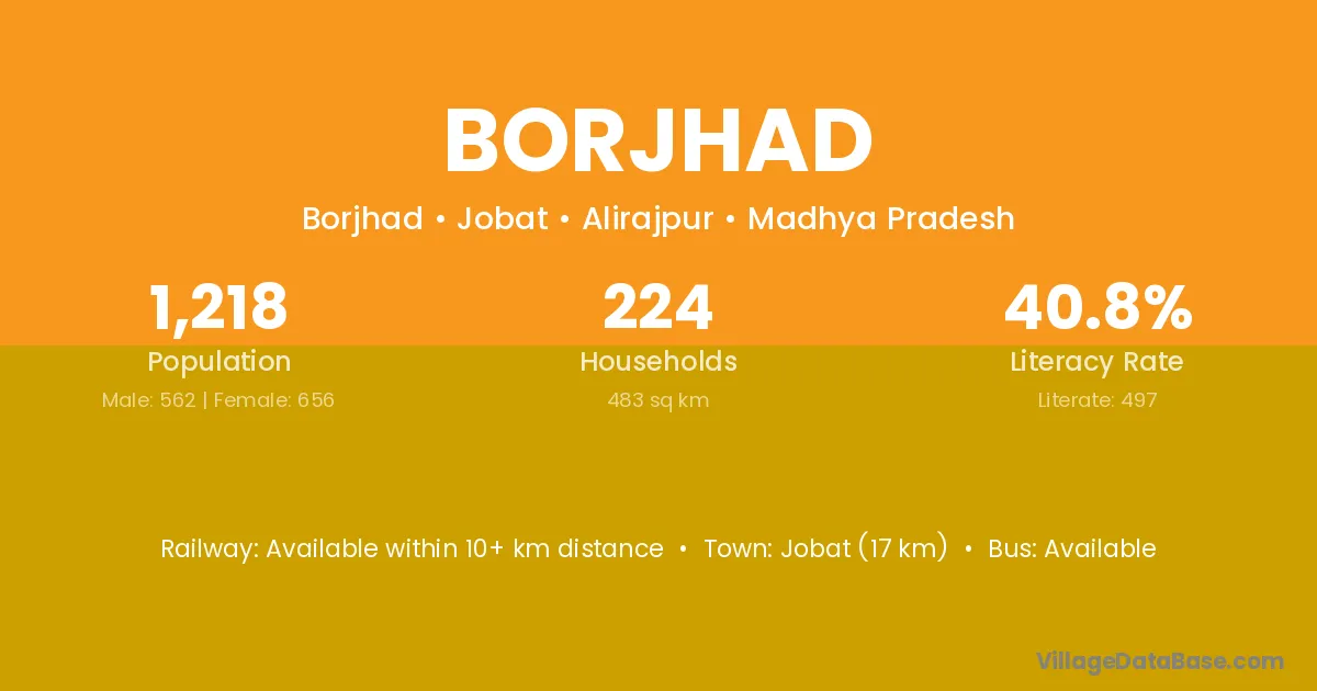 Jobat (17 km) is the nearest town to Borjhad village for major economic activities and is located approximately 17 km away.