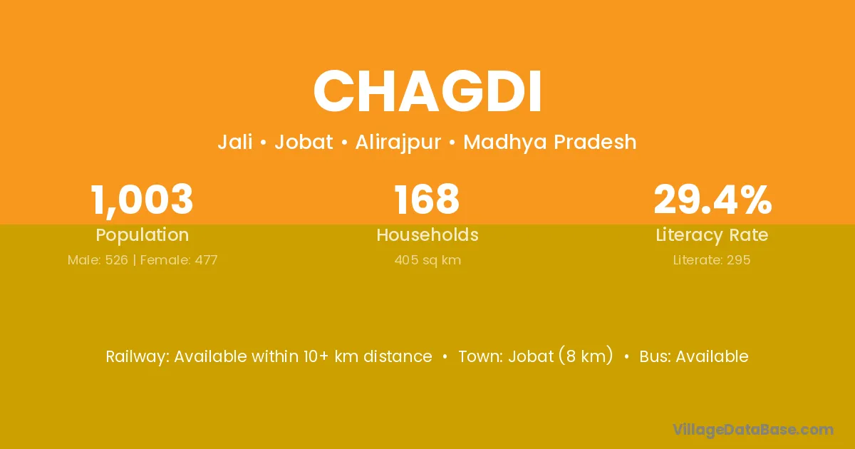 Jobat (8 km) is the nearest town to Chagdi village for major economic activities and is located approximately 8 km away.