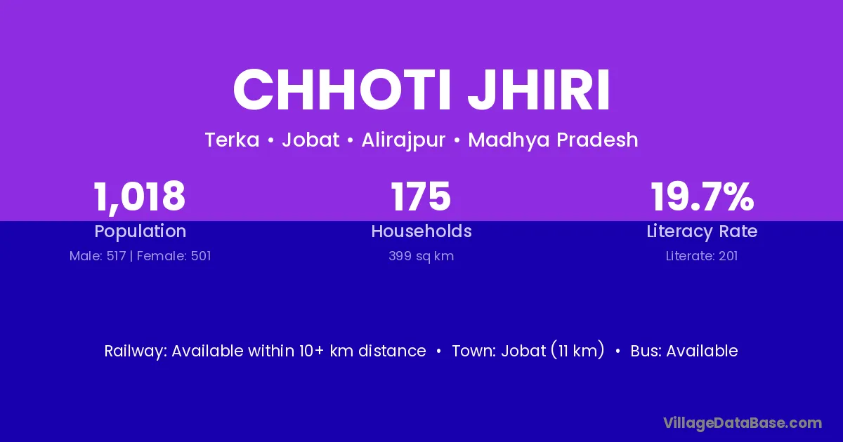 Jobat (11 km) is the nearest town to Chhoti Jhiri village for major economic activities and is located approximately 11 km away.