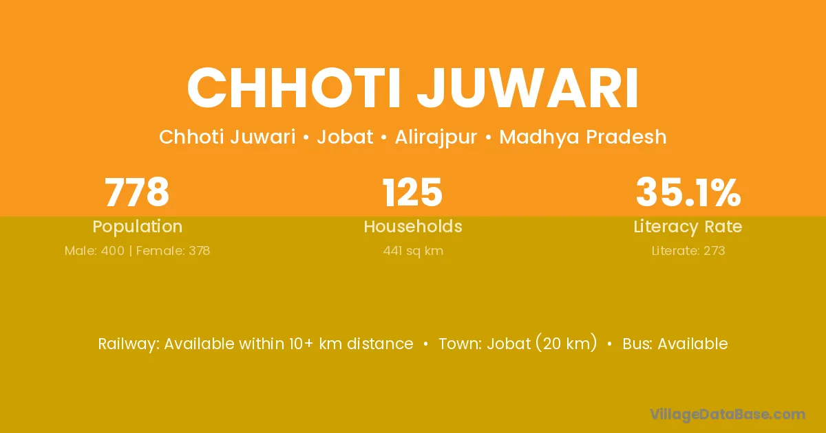 Jobat (20 km) is the nearest town to Chhoti Juwari village for major economic activities and is located approximately 20 km away.