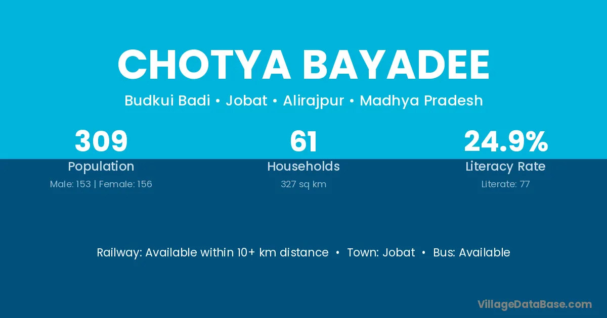 Chotya Bayadee village has a total population of 309 people, of which 153 are males and 156 are females.