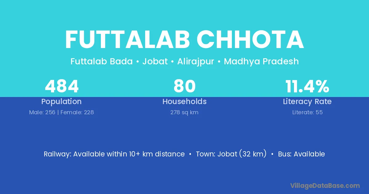 Jobat (32 km) is the nearest town to Futtalab Chhota village for major economic activities and is located approximately 32 km away.