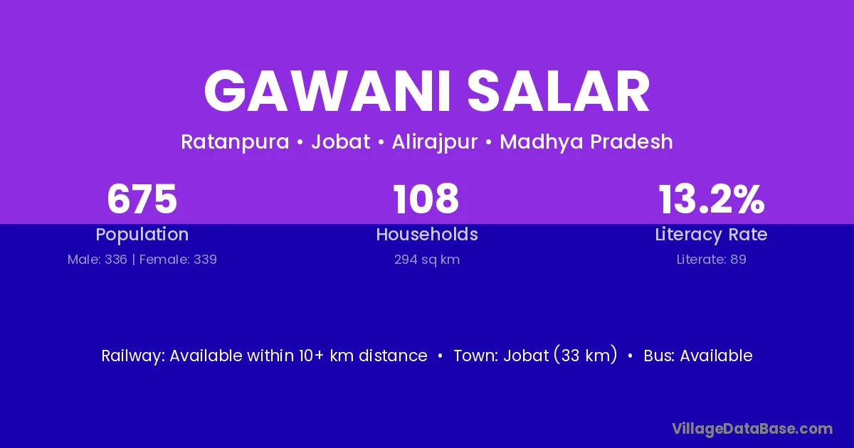 Jobat (33 km) is the nearest town to Gawani Salar village for major economic activities and is located approximately 33 km away.
