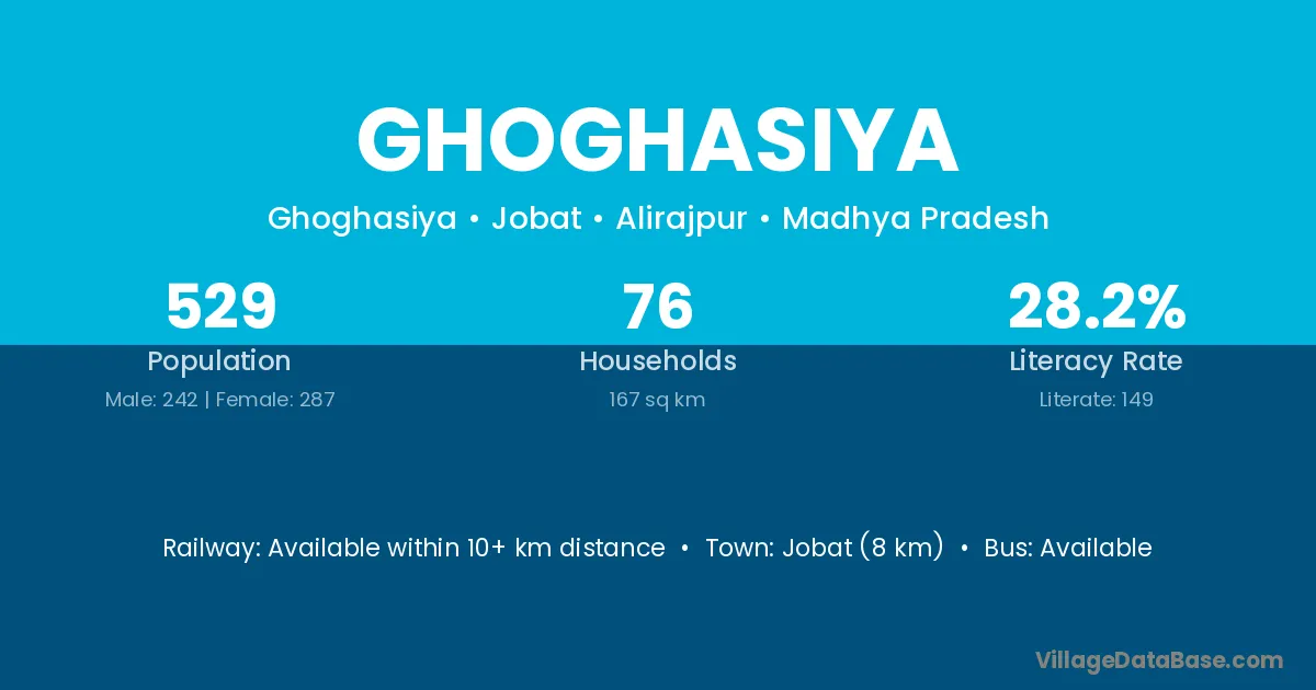 Jobat (8 km) is the nearest town to Ghoghasiya village for major economic activities and is located approximately 8 km away.