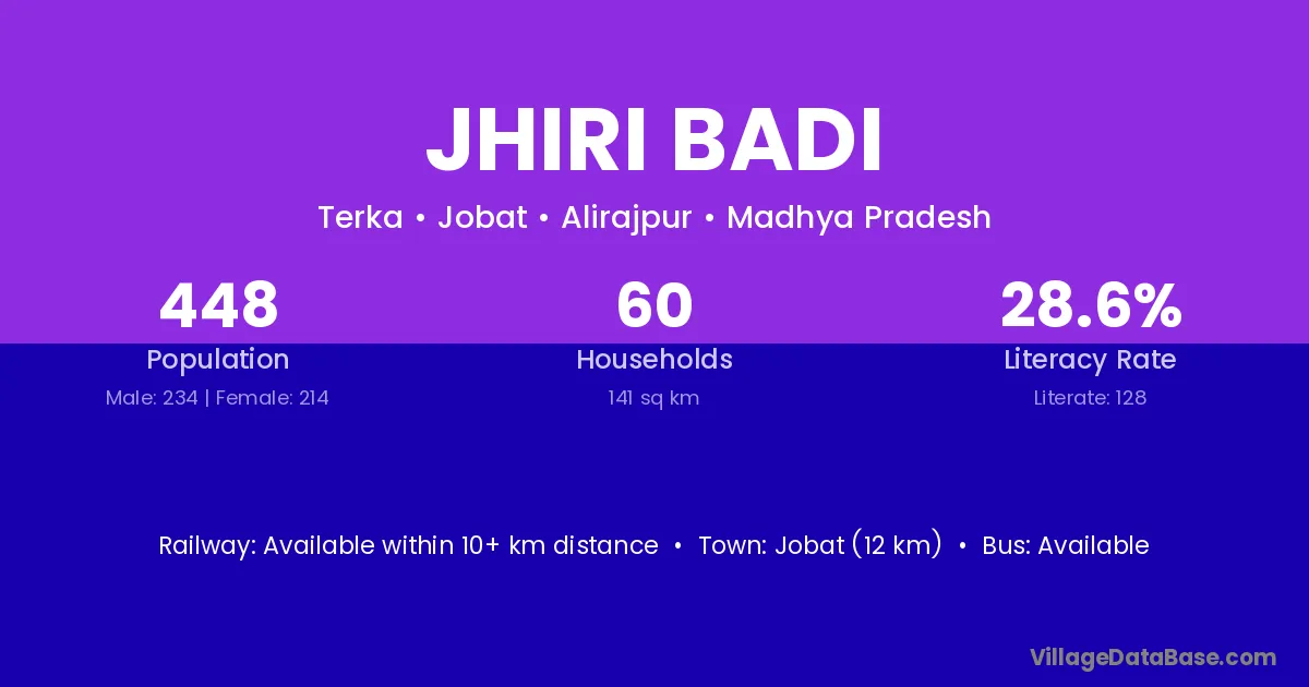 Jobat (12 km) is the nearest town to Jhiri Badi village for major economic activities and is located approximately 12 km away.