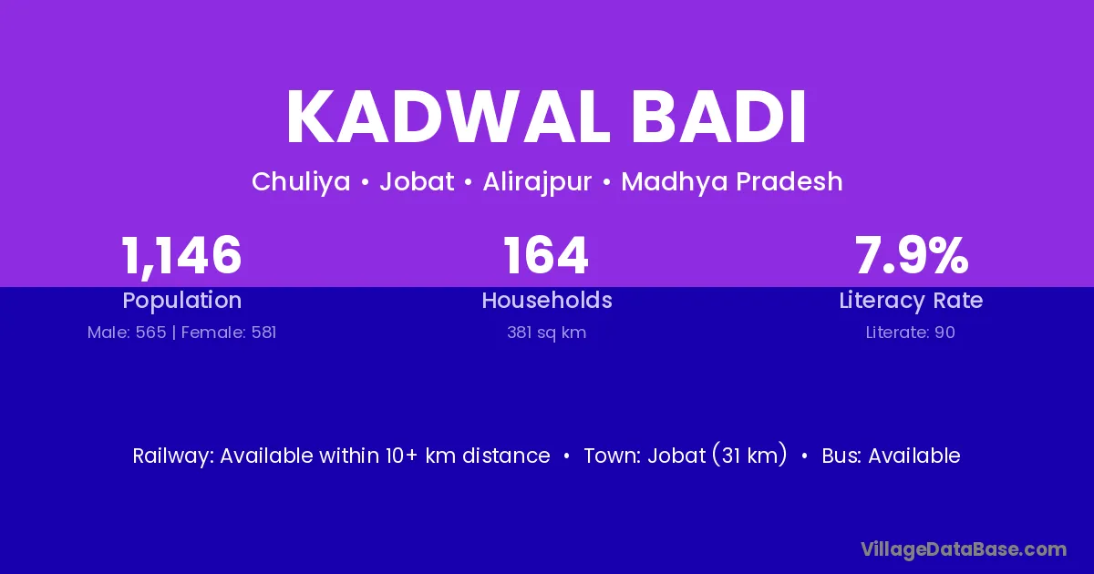 Jobat (31 km) is the nearest town to Kadwal Badi village for major economic activities and is located approximately 31 km away.