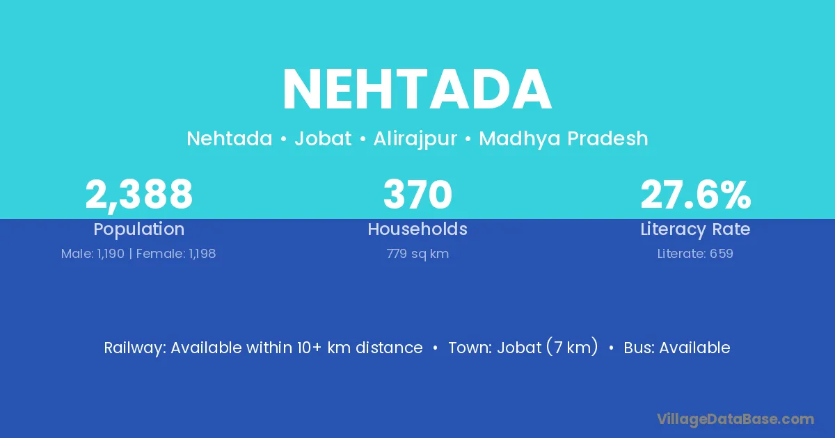 Jobat (7 km) is the nearest town to Nehtada village for major economic activities and is located approximately 7 km away.