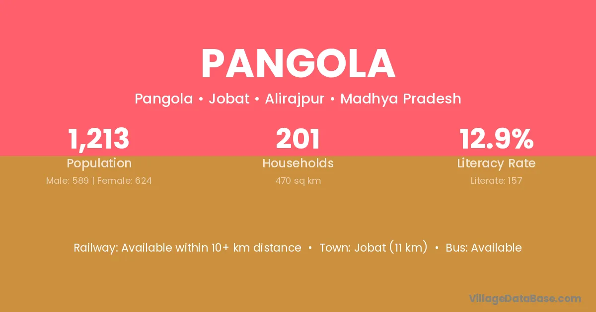 Jobat (11 km) is the nearest town to Pangola village for major economic activities and is located approximately 11 km away.