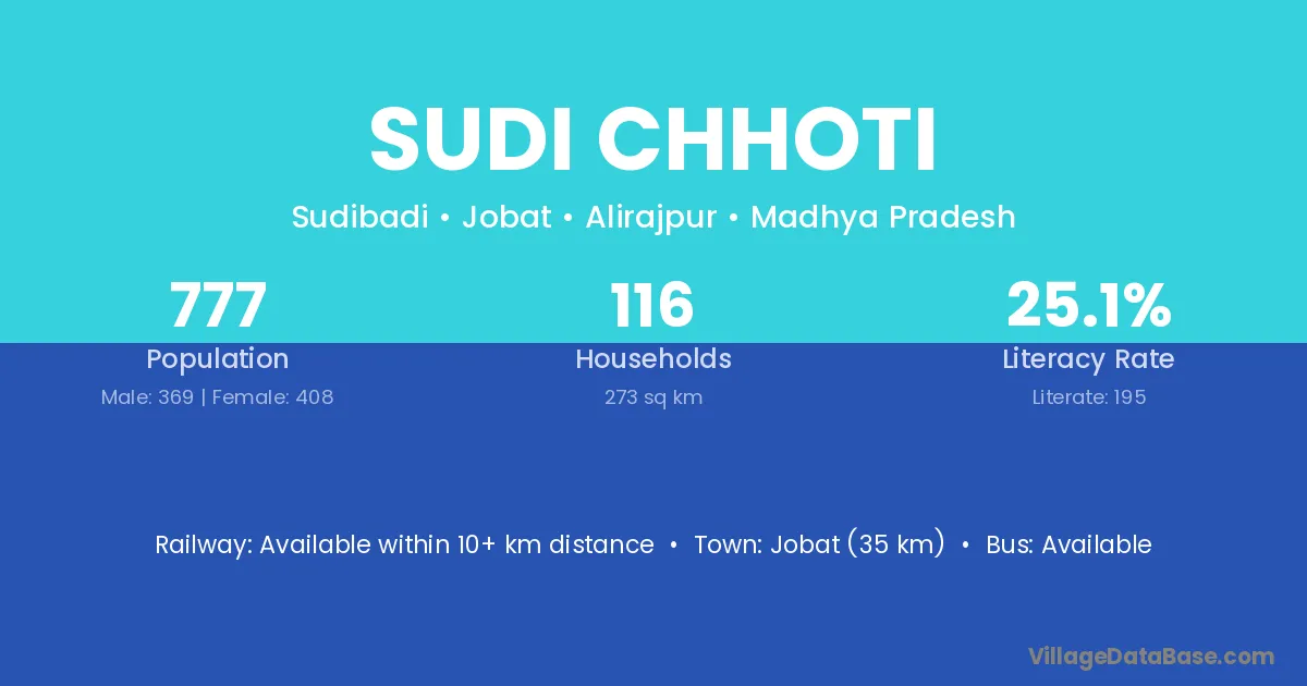 Jobat (35 km) is the nearest town to Sudi Chhoti village for major economic activities and is located approximately 35 km away.