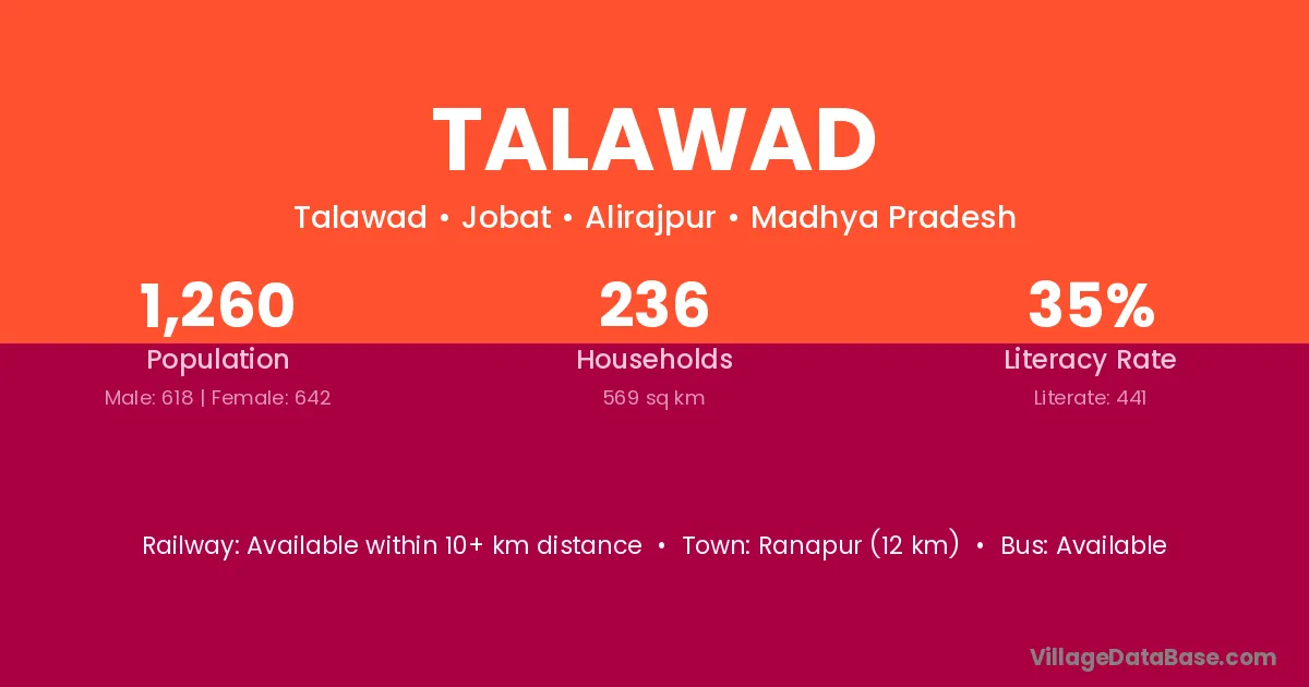 Ranapur (12 km) is the nearest town to Talawad village for major economic activities and is located approximately 12 km away.