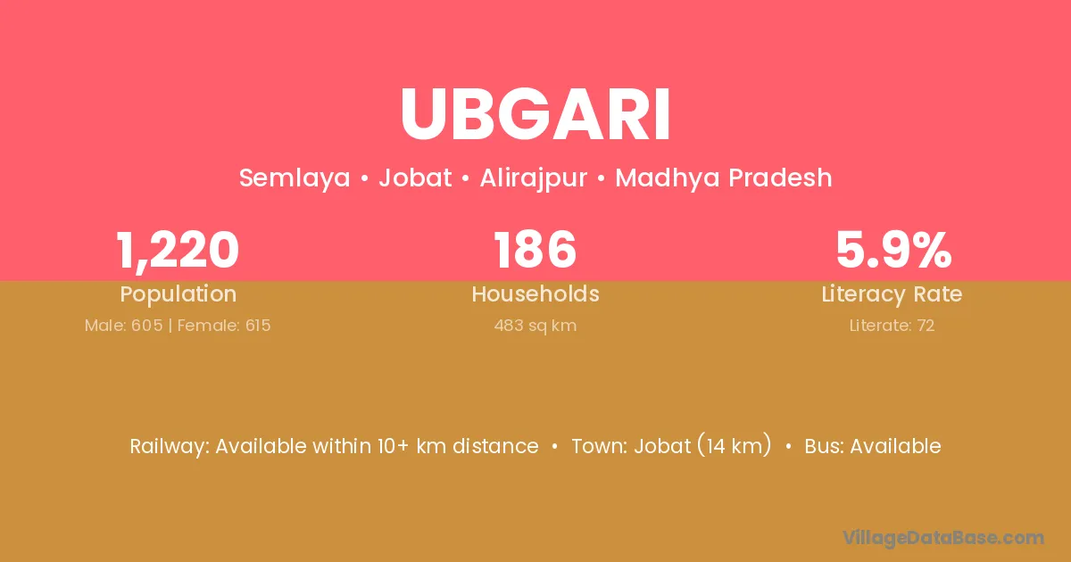 Ubgari village has a total population of 1,220 people, of which 605 are males and 615 are females.