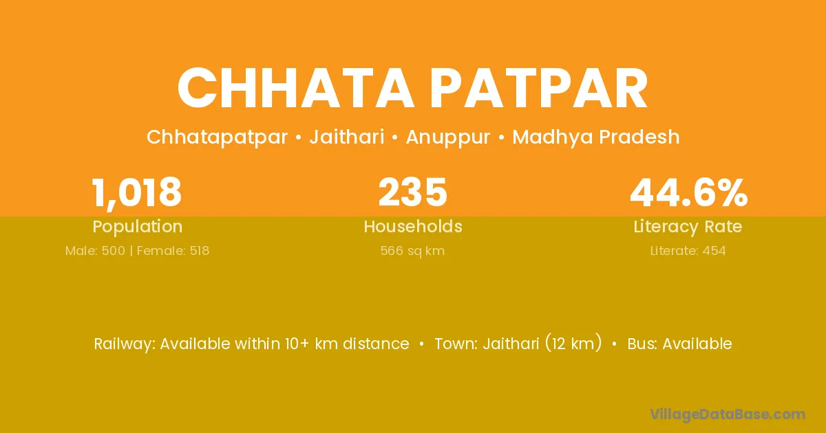Chhata Patpar village has a total population of 1,018 people, of which 500 are males and 518 are females.