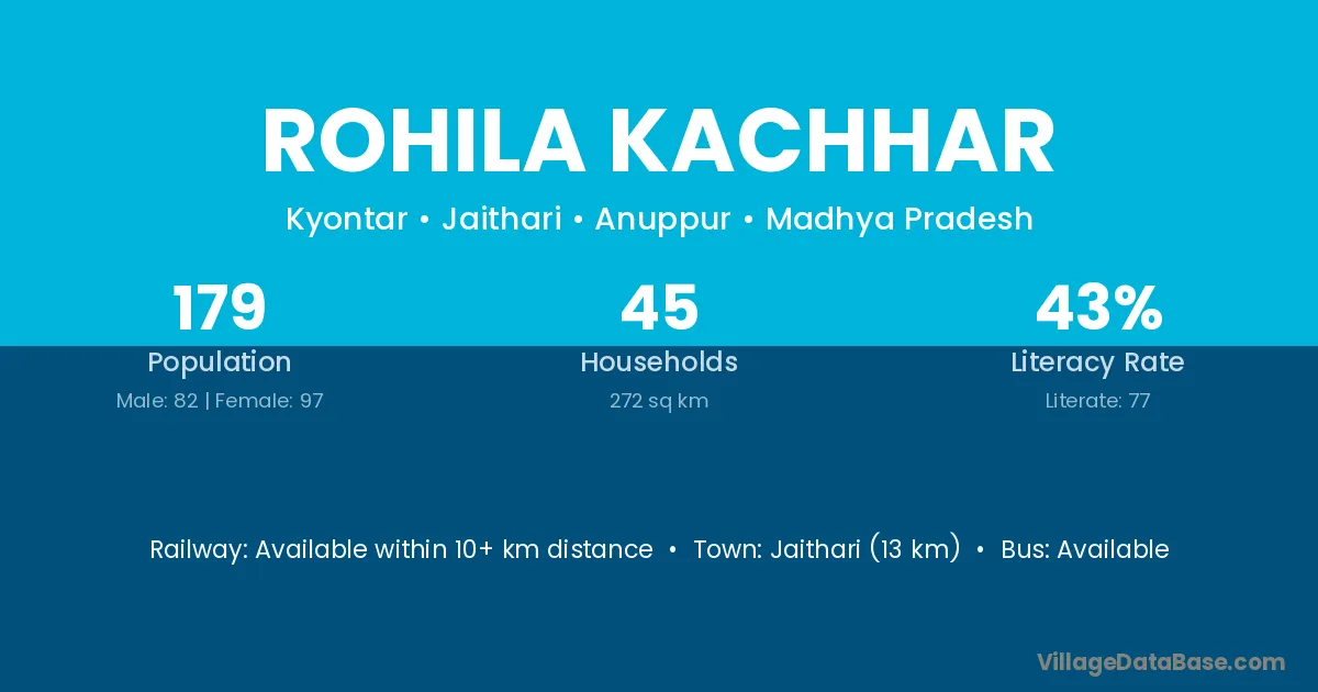 Rohila Kachhar village has a total population of 179 people, of which 82 are males and 97 are females.
