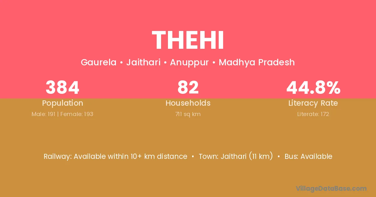 Jaithari (11 km) is the nearest town to Thehi village for major economic activities and is located approximately 11 km away.