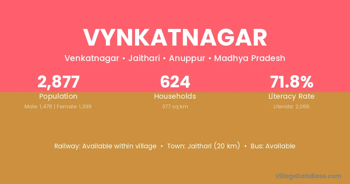 Jaithari (20 km) is the nearest town to Vynkatnagar village for major economic activities and is located approximately 20 km away.