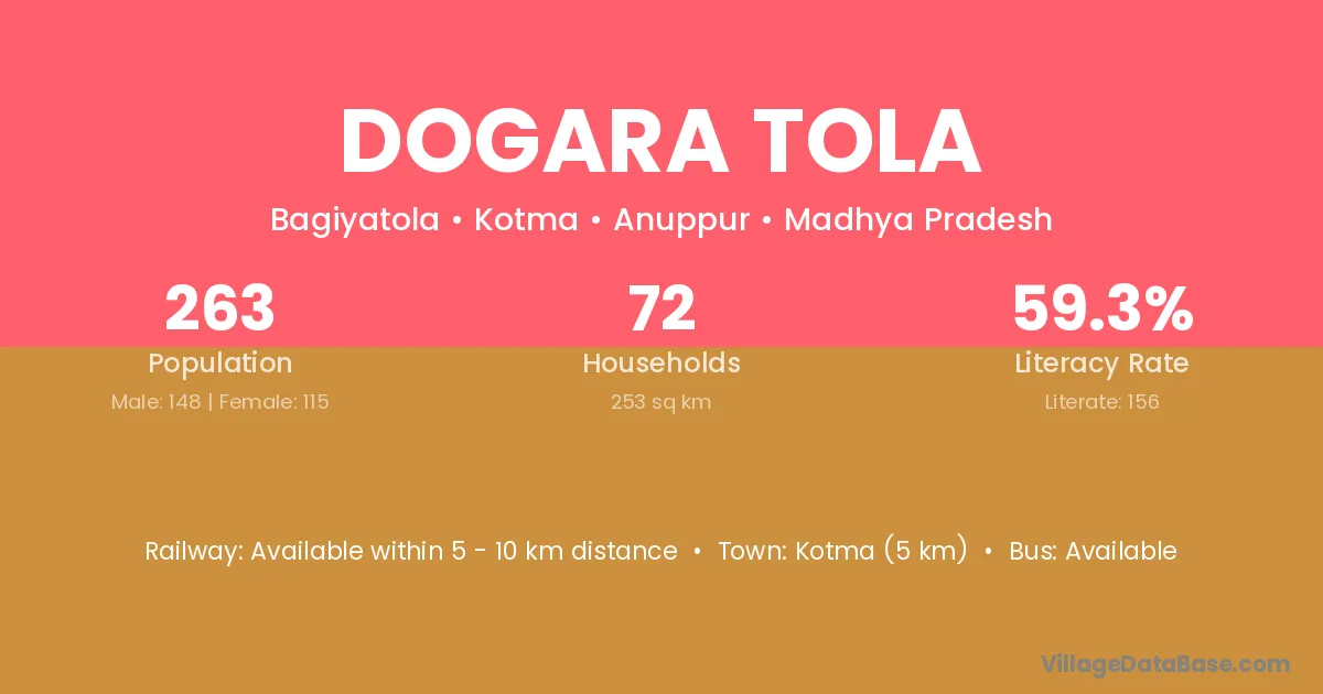 Dogara Tola village has a total population of 263 people, of which 148 are males and 115 are females.