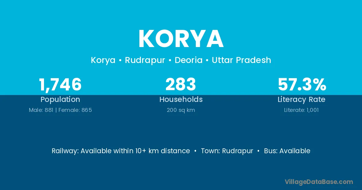 Korya village has a total population of 497 people, of which 249 are males and 248 are females.