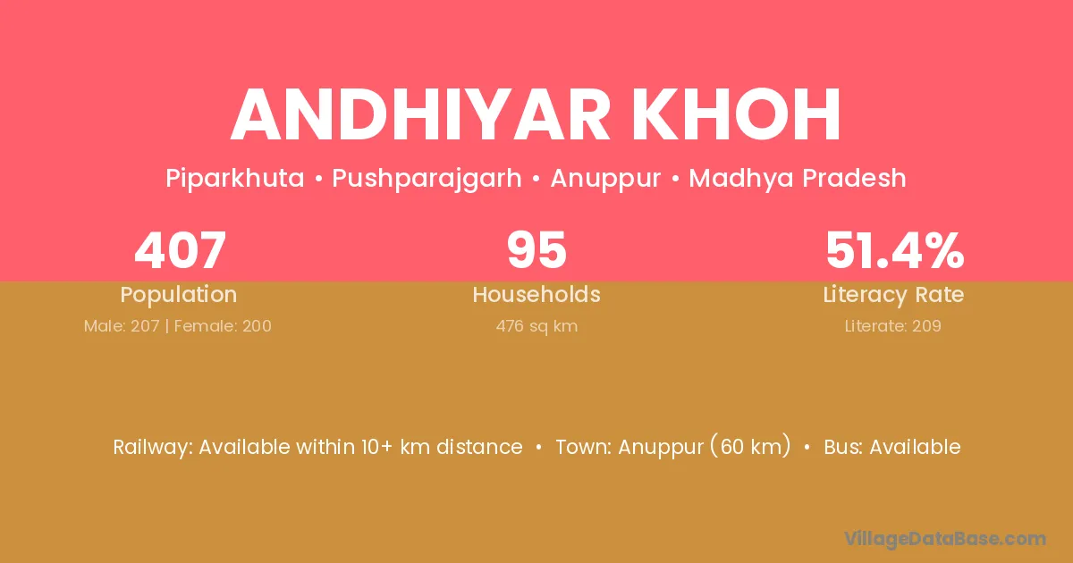 Andhiyar Khoh village has a total population of 407 people, of which 207 are males and 200 are females.
