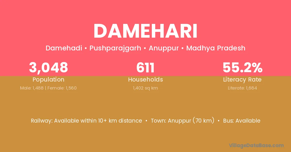 Anuppur (70 km) is the nearest town to Damehari village for major economic activities and is located approximately 70 km away.