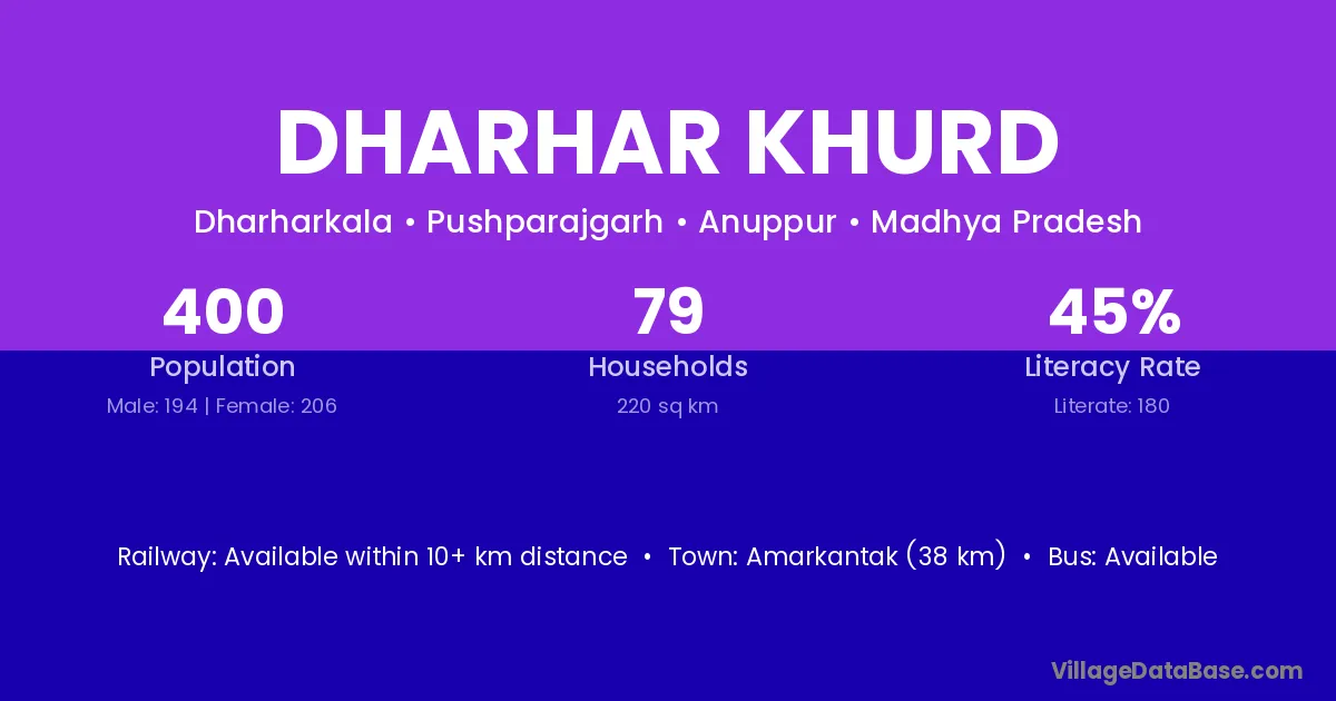 Amarkantak (38 km) is the nearest town to Dharhar Khurd village for major economic activities and is located approximately 38 km away.