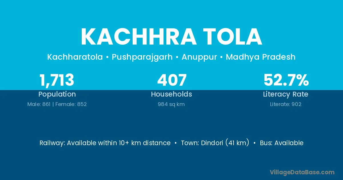 Kachhra Tola village has a total population of 1,713 people, of which 861 are males and 852 are females.