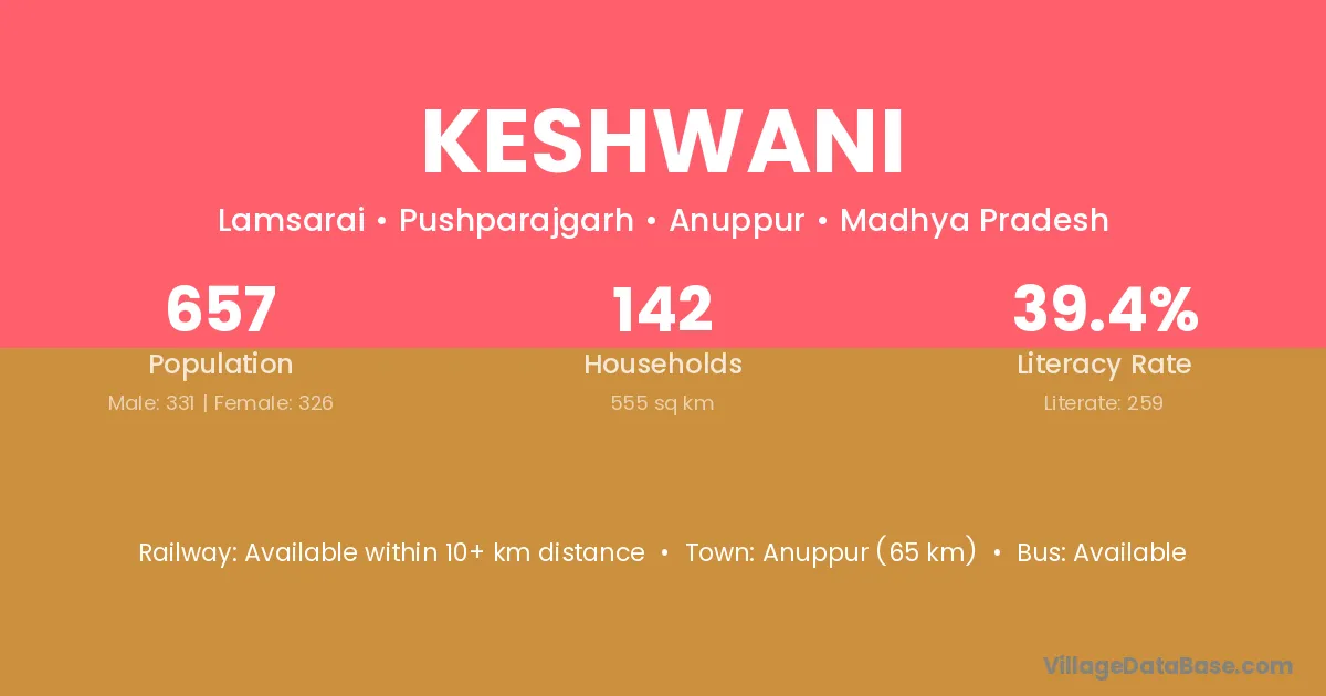 Anuppur (65 km) is the nearest town to Keshwani village for major economic activities and is located approximately 65 km away.