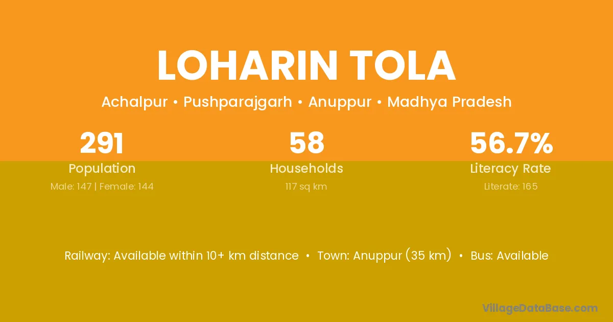 Anuppur (35 km) is the nearest town to Loharin Tola village for major economic activities and is located approximately 35 km away.