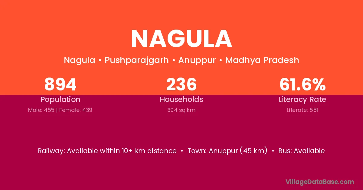 Anuppur (45 km) is the nearest town to Nagula village for major economic activities and is located approximately 45 km away.