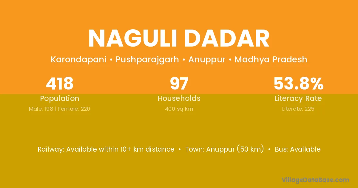 Anuppur (50 km) is the nearest town to Naguli Dadar village for major economic activities and is located approximately 50 km away.