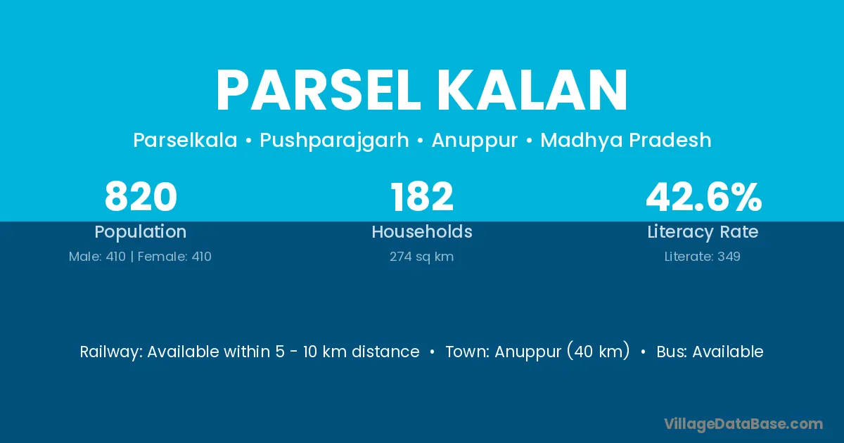 Anuppur (40 km) is the nearest town to Parsel Kalan village for major economic activities and is located approximately 40 km away.