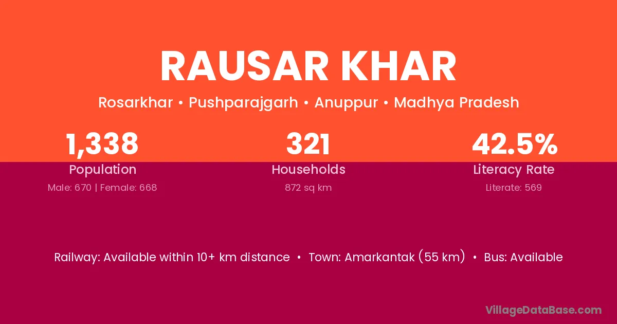 Amarkantak (55 km) is the nearest town to Rausar Khar village for major economic activities and is located approximately 55 km away.