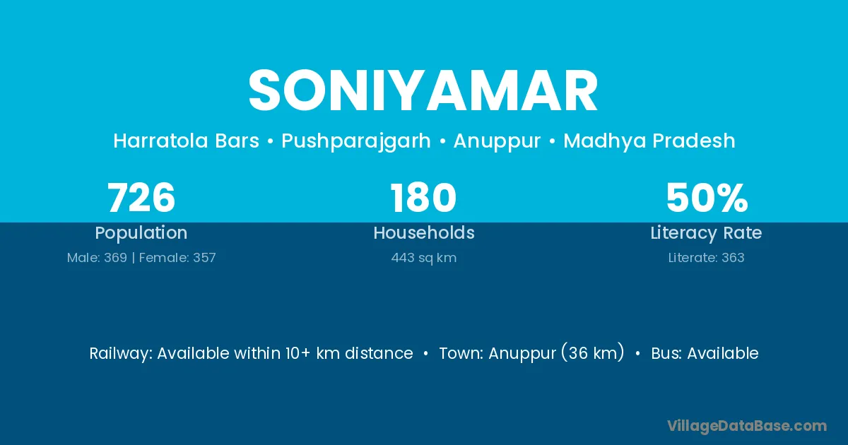 Anuppur (36 km) is the nearest town to Soniyamar village for major economic activities and is located approximately 36 km away.