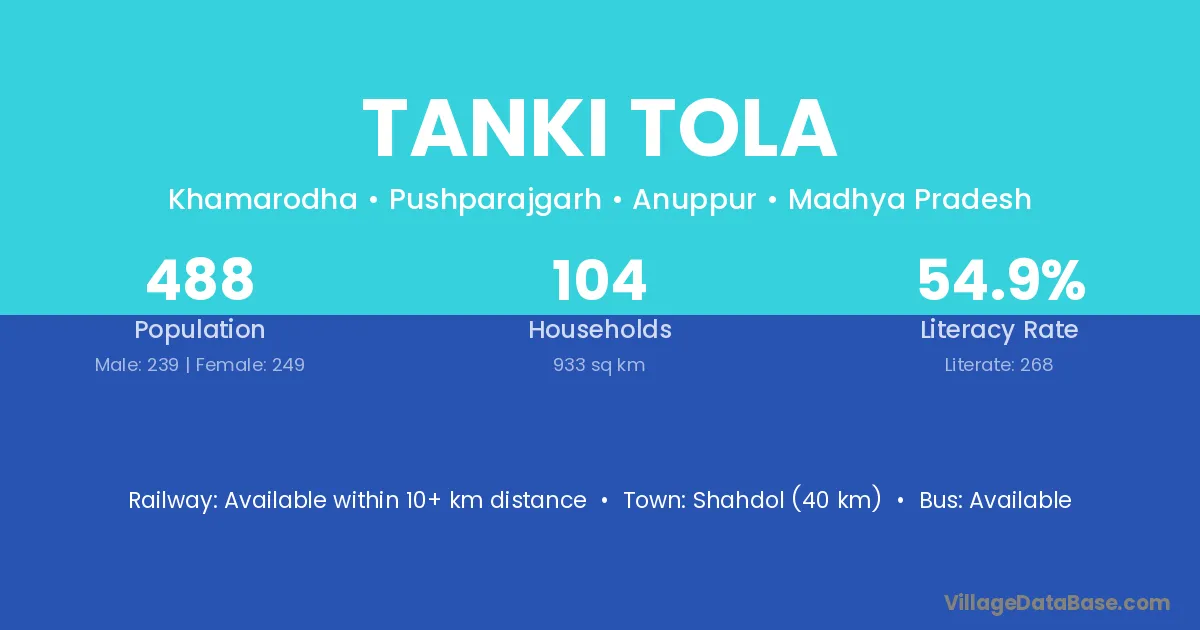 Shahdol (40 km) is the nearest town to Tanki Tola village for major economic activities and is located approximately 40 km away.