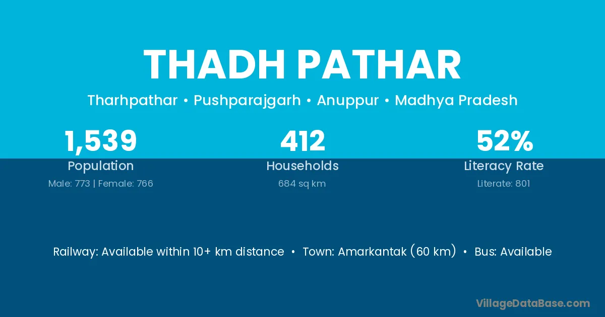 Amarkantak (60 km) is the nearest town to Thadh Pathar village for major economic activities and is located approximately 60 km away.