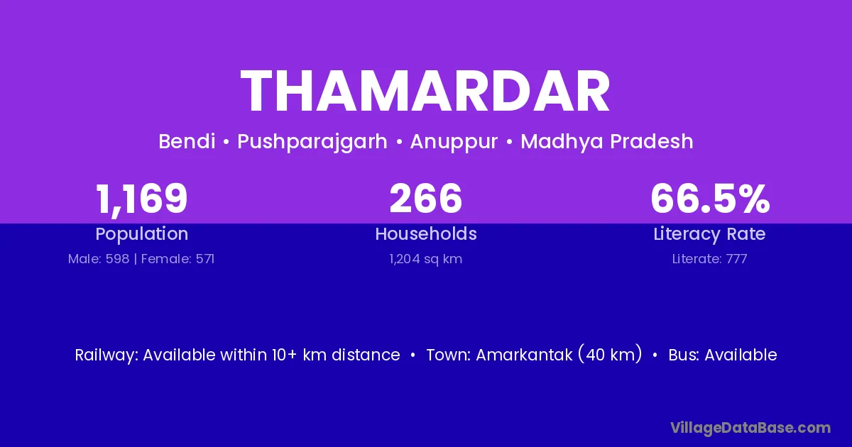 Amarkantak (40 km) is the nearest town to Thamardar village for major economic activities and is located approximately 40 km away.