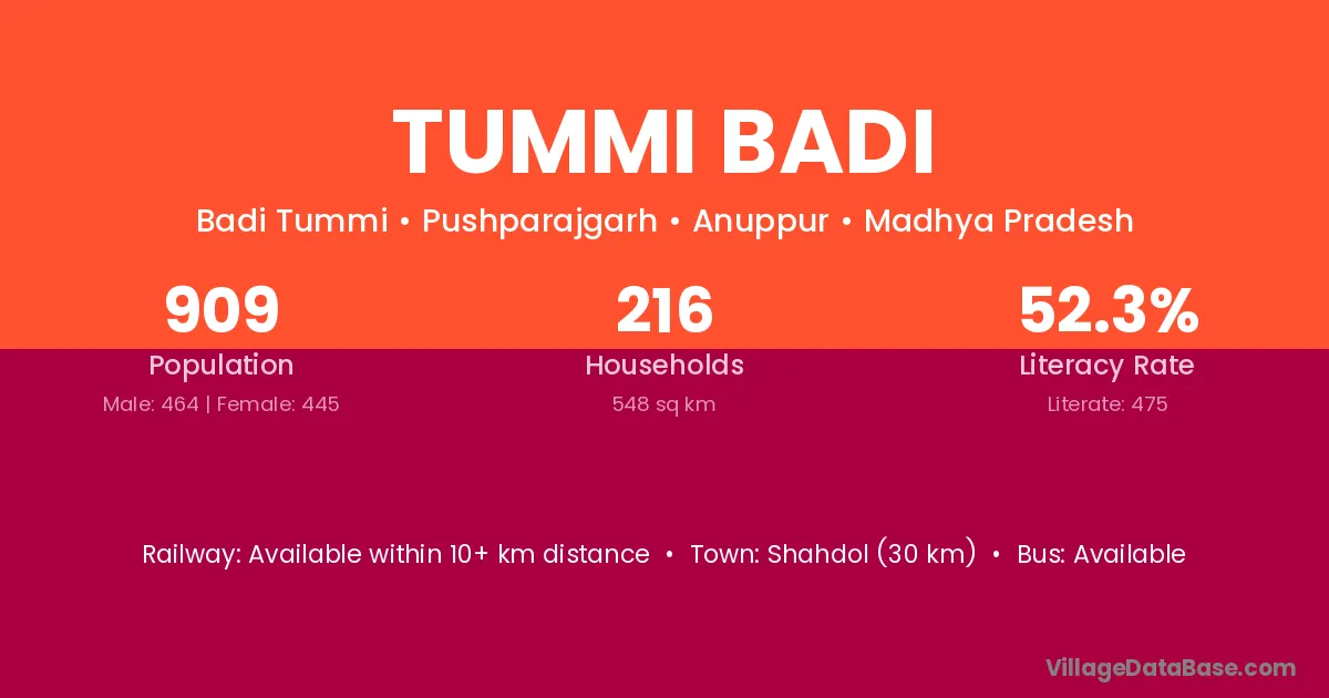 Shahdol (30 km) is the nearest town to Tummi Badi village for major economic activities and is located approximately 30 km away.