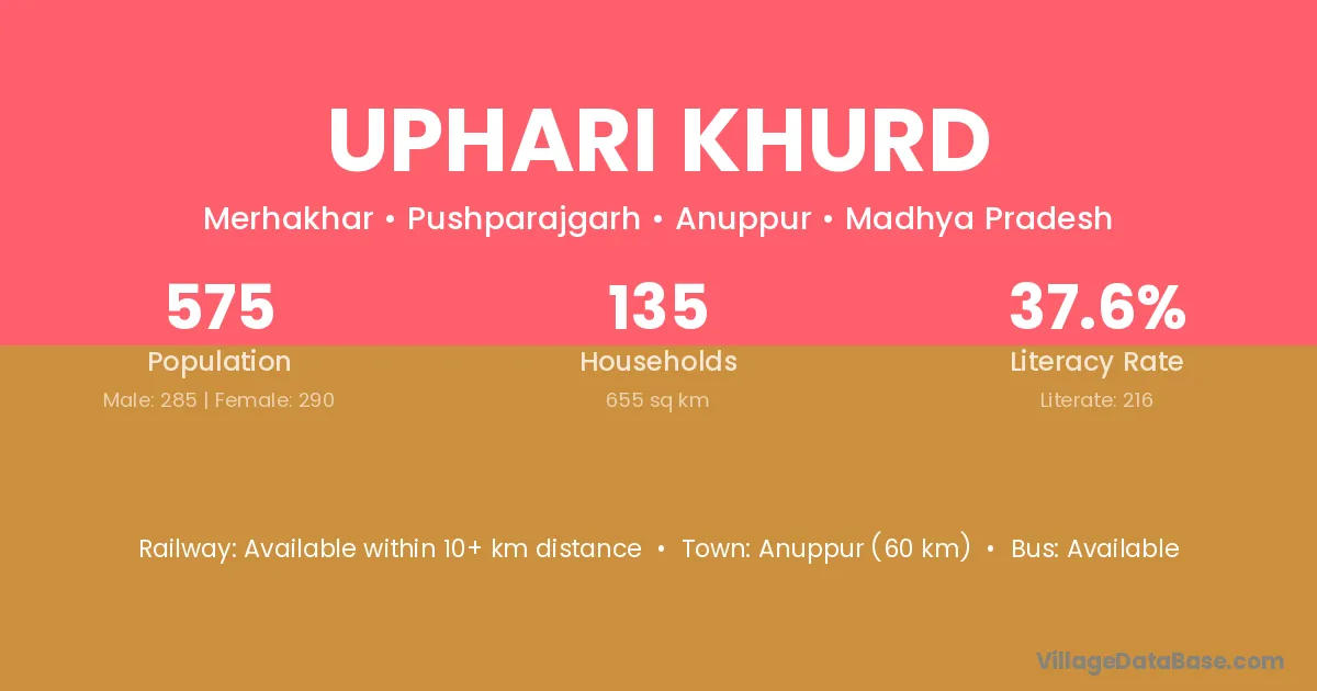 Anuppur (60 km) is the nearest town to Uphari Khurd village for major economic activities and is located approximately 60 km away.