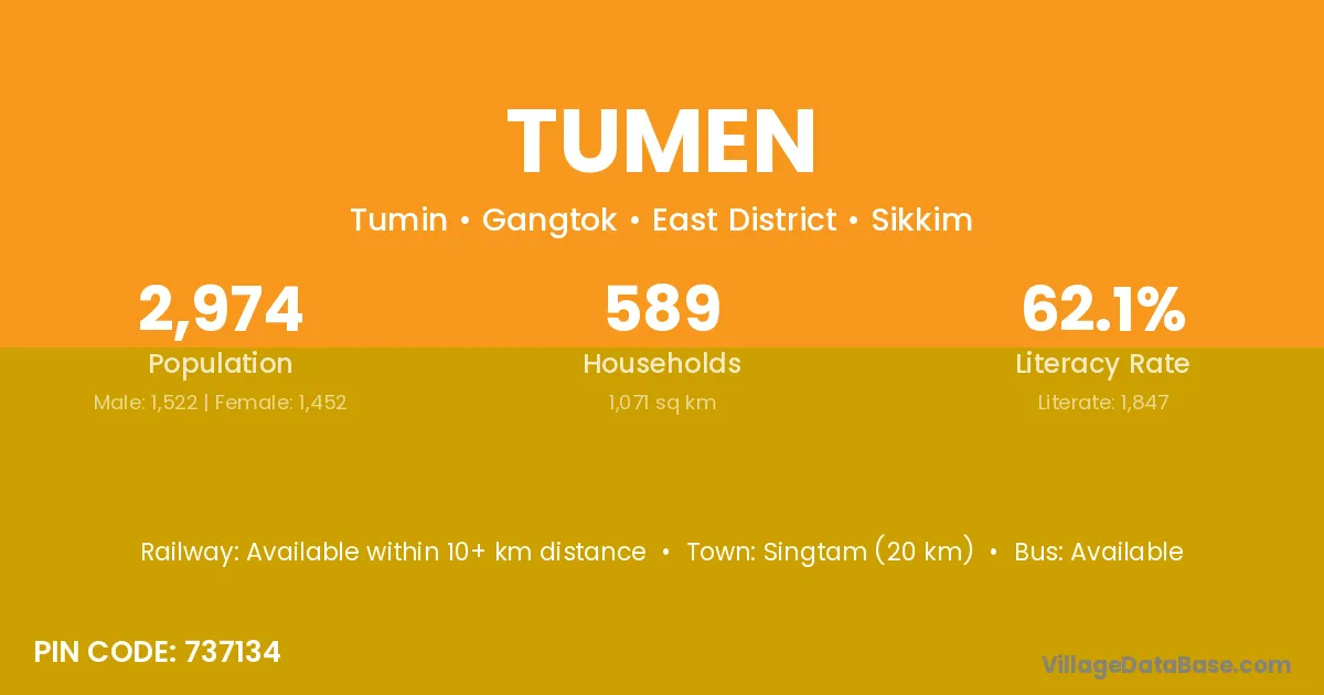 Tumen village has a total population of 3,129 people, of which 1,625 are males and 1,504 are females.