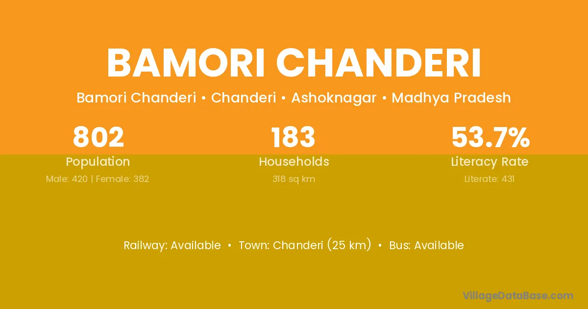 Bamori Chanderi village has a total population of 802 people, of which 420 are males and 382 are females.