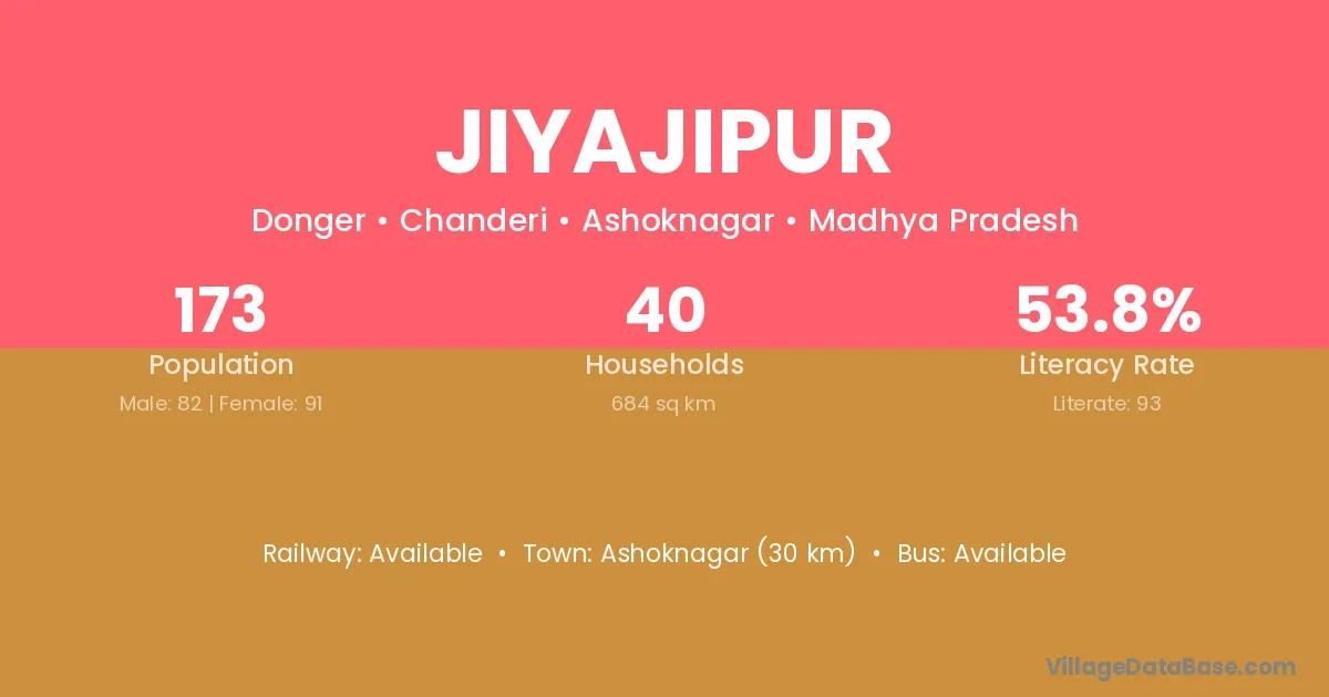 Ashoknagar (30 km) is the nearest town to Jiyajipur village for major economic activities and is located approximately 30 km away.