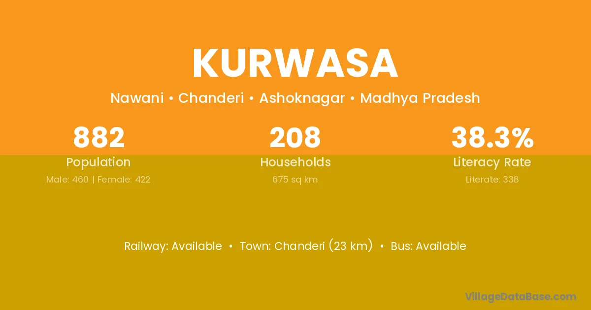 Chanderi (23 km) is the nearest town to Kurwasa village for major economic activities and is located approximately 23 km away.