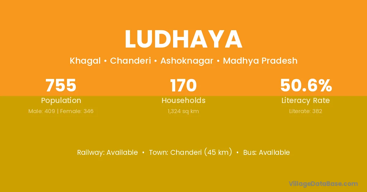 Chanderi (45 km) is the nearest town to Ludhaya village for major economic activities and is located approximately 45 km away.