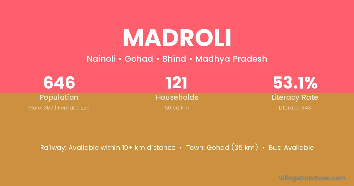 Chanderi (18 km) is the nearest town to Madroli village for major economic activities and is located approximately 18 km away.