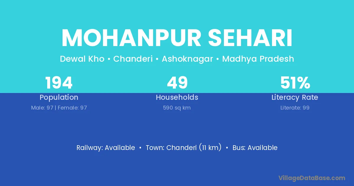 Chanderi (11 km) is the nearest town to Mohanpur Sehari village for major economic activities and is located approximately 11 km away.