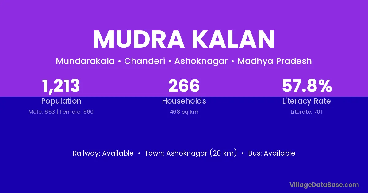Ashoknagar (20 km) is the nearest town to Mudra Kalan village for major economic activities and is located approximately 20 km away.