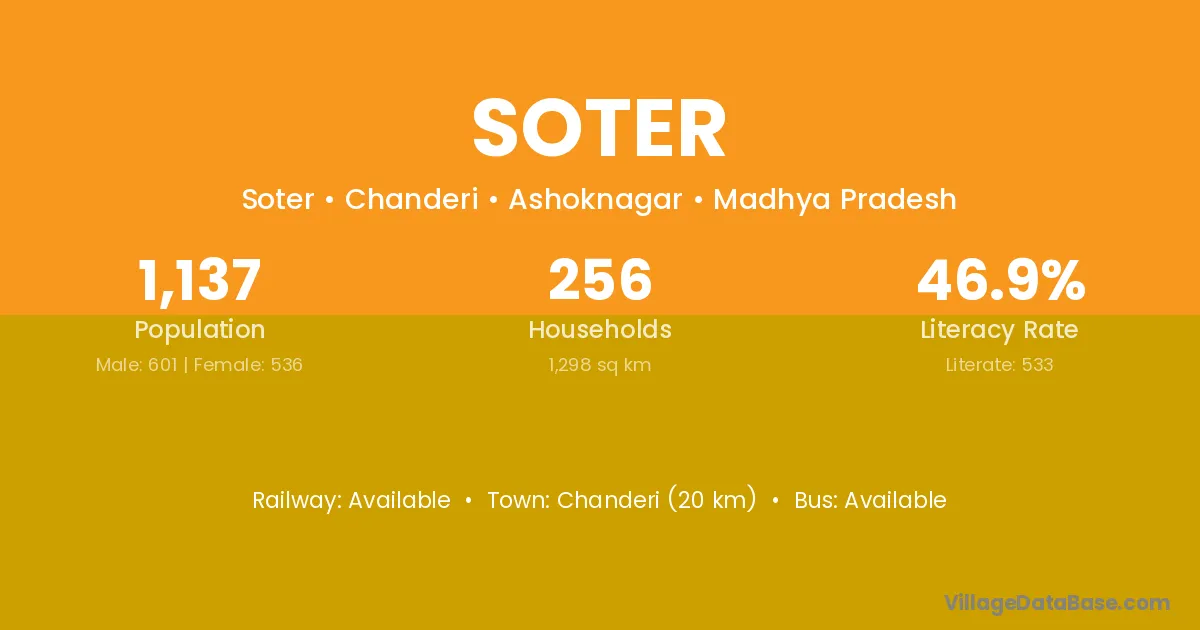 Chanderi (20 km) is the nearest town to Soter village for major economic activities and is located approximately 20 km away.