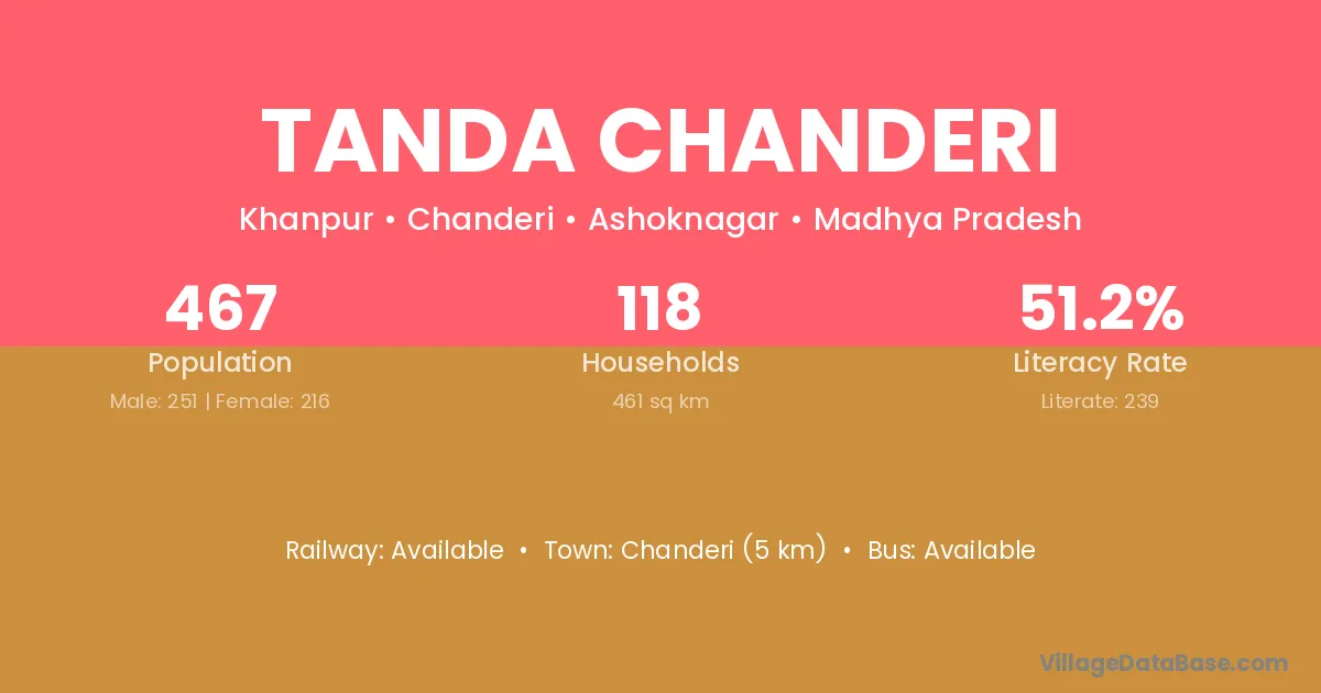 Tanda Chanderi village has a total population of 467 people, of which 251 are males and 216 are females.