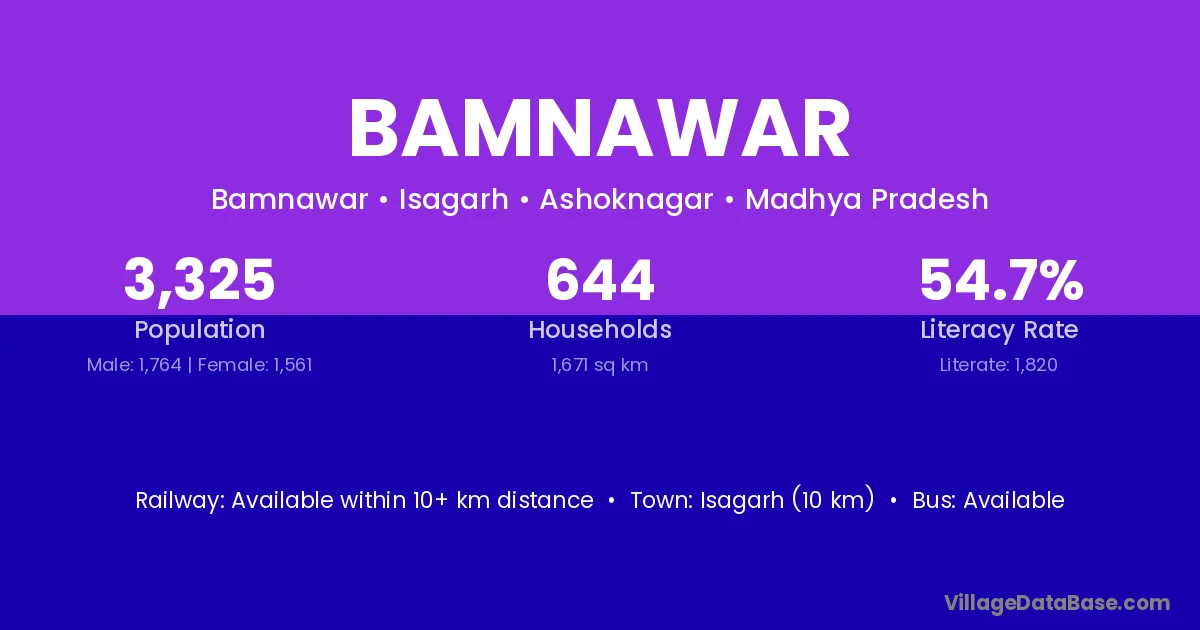 Isagarh (10 km) is the nearest town to Bamnawar village for major economic activities and is located approximately 10 km away.